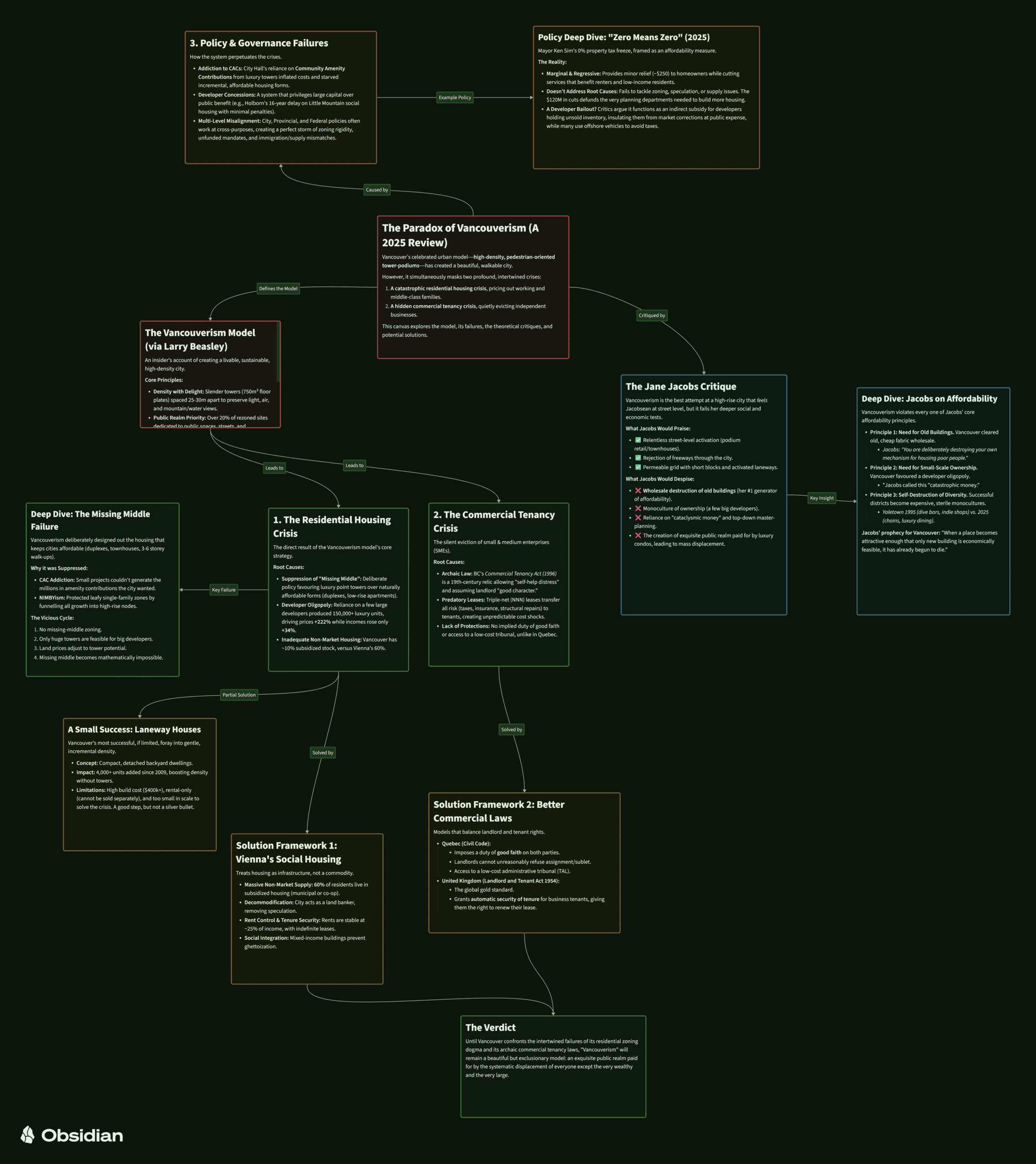Jane Jacobs, the legendary urbanist, argued that great cities need four generators of diversity. Vancouverism succeeds at the visual level—active sidewalks, short blocks—but fails catastrophically at the structural level.